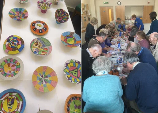 Academician Phil Creek uses Clarice Cliff , English ceramic artist active from 1922 to 1963. as his inspiration for the participants in a Memory Cafe workshop at the Thelma Hulbert Gallery, Honiton.